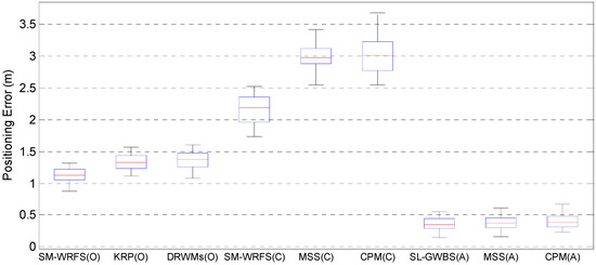 Finally, the proposed SM-WRFS structure is compared with two state-of-art positioning algorithms in the office scene and 3D corridor scene, in which the Kalman-filter-based RTT and PDR fusion algorithm (KRP) [17] and unscented Kalman-filter-based multi-source fusion algorithm (DRWMs) [36] are compared in the office scene, and the multi-sensor multi-floor system (MSS) [27] and cross-layer positioning method (CPM) [37] are compared in the corridor scene. The staircase under the corridor scene almost does not exist in the fingerprinting database coverage due to the distribution characteristics of deployed local Wi-Fi APs. The accuracy comparison of 2D localization and altitude estimation are shown in Figure 14.