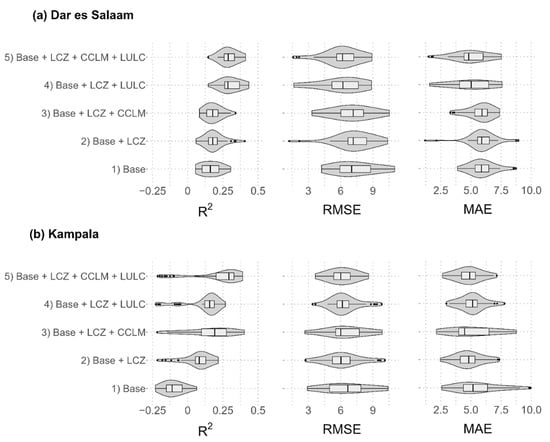 Comparison of model performances obtained with the five models for (a) Dar es Salaam and (b) Kampala: Base model, Base + LCZ model, Base + LCZ + CCLM model, Base + LCZ + LUCL model, and Base + LCZ + CCLM + LULC model. A recursive feature elimination (RFE) was used, except for the Base model, and this RFE was implemented independently for each model. Model performances are computed on the test sets and provided for the 50 RF models built in spatial cross-validation in terms of R-squared, root mean square error (RMSE) and mean absolute error (MAE).
