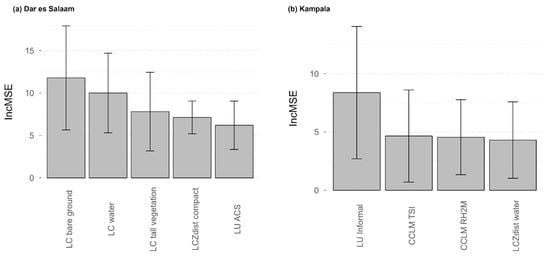 Covariate importance in the best model (Base + LCZ + CCLM + LULC) for (a) Dar es Salaam and (b) Kampala. The covariate importance is an average increase in mean squared error (Inc MSE) computed across the 50 models built in spatial cross-validation. The error bars represent the standard deviation computed across these 50 models.