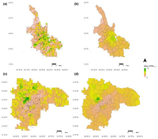 Model performances remained quite low (R-squared ≤ 0.33) and results show a high variability in covariate importance, which is not surprising given that we used a spatial cross-validation. Figure 3 shows the predicted PfPR2−10 maps for Dar es Salaam and Kampala at 1 km raster level (Figure 3a,c) and aggregated by administrative unit (Figure 3b,d).