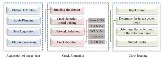 - Using unmodeled data for combined UAV navigation information and pixel information of cracks on the image, a pioneering method for rapidly locating crack fields is proposed.