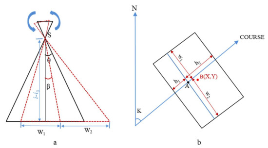 The aerial images captured by the UAV contain information on the dimensions of the image, including the image width (W0), the image height (H0), and the focal length (f) of the aerial camera. Because of the influence of the pitch and roll angle, the image is also not absolutely horizontal, and the same is true for the mapped area of the image changes. Figure 6a represents the change of its mapping area when the image undergoes side deviation; is the flight altitude and is the ground elevation. Since there are geometric distortions in the image and the deviation is greater in the area farther away from the image center, replacing the prediction frame with its shape center point can improve the positioning accuracy. The geometric relationship between the remote-sensing image and its mapping area is used to determine the rectangular plane coordinates of the crack point on the image. First, the latitude and longitude (B0, L0) of the aerial point collected in POS data are converted into UTM coordinates (X0, Y0), and the orthographic projection of the aerial point on the image deviates from the center point of the image because the orthophoto is not horizontal. Thus, the image center point coordinates need to be corrected. As shown in Figure 6b, where point A is the vertical projection point of the aerial point on the image, point B (X, Y) is the actual center point of the image.