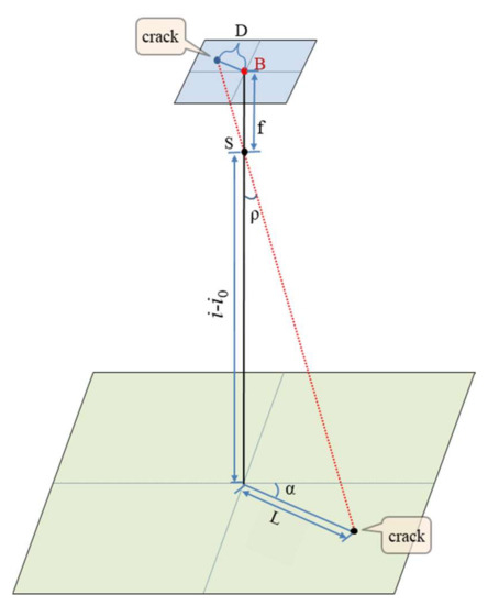 From the distance and azimuth of the center point of the image on the field to the center of the crack shape, the plane’s right-angle coordinates (x, y) of the center of the crack shape on the field can be obtained from Equation (7):