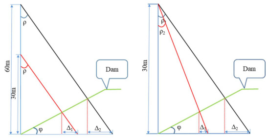 The main factors affecting positioning accuracy are, first, the existence of lateral deviation and pitch of the orthophoto causes the mapping range of the orthophoto to change. Second, the deep excavation canal section has large variations in ground undulation, resulting in inconsistent photographic scales in different areas of the image. Third, the center projection image features are geometrically distorted, and the further away from the projection center, the greater the distortion. To improve the positioning accuracy, we mainly proceed by reducing the flight height of the UAV and controlling the size of the angle between the projected ray and the plumb line; as shown in Figure 8, the lower the altitude, the smaller the angle, and the smaller the point error. Influenced by the terrain and features of the measurement area, it was finally decided that the UAV would fly at an altitude of 30 m and only retain the effective detection area in the middle of the image, accounting for 9% of the overall image. This means that the area of repeated detection is reduced, and the work process is accelerated. It can also largely attenuate the influence of geometric image distortion and effectively improve the accuracy of fracture georeferencing.
