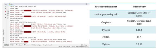 In this experiment, the whole training process of the algorithm used was set to 100 epochs, and 1 epoch is the process of importing the whole dataset for complete training, with the weight decay coefficient of 0.0005 and the momentum parameter set to 0.9. Since the first fifty epoch parameters were adjusted with a large difference from the true value, the training learning rate of the first 50 epochs was set to 0.001. Each epoch was iterated 50 times, and the batch size was set to 16 to make the parameters converge faster. The learning rate of the last 50 epochs was set to 0.0001, with each epoch iterated 100 times, and the batch size was set to 8. The configuration of the experimental environment is shown in Figure 11.