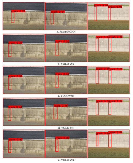 The detection results of each algorithm are shown in Figure 12. YOLO v5x and Faster RCNN have better detection results, and YOLO v5s, YOLO v5m, and YOLO v5l detection effects improved sequentially. Due to the complexity of the background of the channel slope, the detection results can be missed or wrongly detected, and the detection frame can be too small and too large, as shown in Figure 13. When cracks and expansion joints are connected, it is easy to identify them all as cracks. The water pattern paths and cracks on the channel side slopes have strong similarities in shape and tone, and the YOLO v5s and YOLO v5m algorithms do not have a strong ability to distinguish water pattern paths and cracks. The Faster RCNN and YOLO v5x algorithms perform better in detecting channel slope cracks during the experiments, with a higher recall rate; less missed detection, wrong detection, too-small and too-large detection frames; and robustness in recognizing cracks of different shapes and sizes. The overall performance of YOLO v5x is optimal considering the accuracy of detection, speed, and model volume factors. YOLO v5x has some advantages as a channel slope crack-detection algorithm.