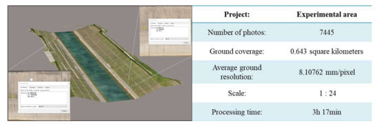 Based on the above method, we conducted a related application study with an aerial camera sortie. To verify the feasibility of the fracture field localization method, we performed a 3D reconstruction of the whole scene and manually extracted the fractures on the model. The length of the experimental area is 730 m, the width is 270 m, and its completed 3D model is shown in Figure 14. By finding cracks on the slope of the channel of the 3D model, we determined that the area contains 74 pieces of crack information in total. By recording the crack latitude and longitude (B, L) on the 3D model and converting the latitude and longitude to UTM coordinates (X, Y), checkpoint plane accuracy was better than 0.5 pixels, the average ground resolution of the 3D model was 8.10762 mm/pixel, and the crack location information obtained through the 3D model was used for analyzing and evaluating the crack-location information obtained from the crack-detection model.