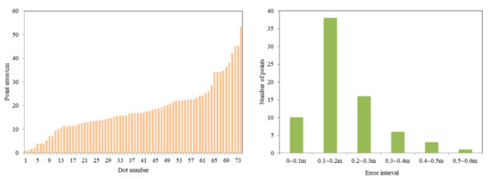 The aerial image data were input into the deep-learning model for crack identification and localization, and the detection results contained information about 76 cracks, including 2 cases of detection errors, as shown in Figure 15. The field-location information of cracks on 74 3D models was recorded, the field information of crack output by deep learning was integrated, and some data are shown in Table 5. In the table, (B, L) represent the latitude and longitude of the crack center point collected from the 3D model; (X, Y) are the UTM coordinate values transformed by the latitude and longitude of the crack points on the 3D model, respectively; (x, y) represent the rectangular plane coordinates of the corresponding cracks obtained from the model detection. The point error of each crack-detection location relative to its corresponding 3D model location can be calculated, and the value of each point error and the interval distribution of its point error are shown in Figure 16. Because the orthophoto is not horizontal and the channel slope is an inclined surface, the image has geometric distortion, which leads to errors in the field positioning of cracks. By controlling the flight height of the UAV, retaining the central area with less geometric distortion on the image as the effective detection area, and correcting the location of the image center point, we finally controlled the positioning error of the cracks to within 0.6 m, of which the point error of less than 0.3 m accounted for 73%, and the interval of the point error approximately obeyed normal distribution. Thus, it can be seen that the accuracy of the crack plane’s right-angle coordinate points obtained by the model can fully meet the needs of channel slope crack maintenance, which verifies the effectiveness of this research method in the detection and positioning of cracks on the slope of the South–North Water Transfer Channel.