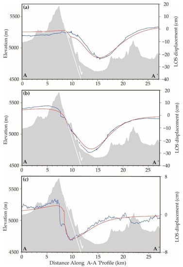 (a,b) are profiles of coseismic LOS displacements and topography, and (c) are profiles of postseismic LOS displacements and topography. Note that (i) The lines of profiles (a,b) are shown in Figure 2a,f,c is the profile line of the LOS postseismic displacement 308 days after the event; and (ii) The observed LOS displacements along the profiles are shown in blue, the modeled LOS displacements in red, and the topography is shown as grayscale.