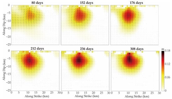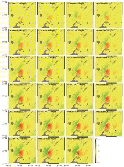 In this study, 24 Sentinel-1A ascending images acquired during the period from 30 July 2020 to 13 July 2021 were interferometrically processed to generate postseismic interferograms with small temporal baselines (<60 days) and small spatial baselines (<150 m) (Figure 4). Then the SBAS-InSAR technique was used to obtain the postseismic deformation time series (Figure 5). SBAS-InSAR is a commonly used InSAR time series approach to utilize multiple interferograms with short spatial and temporal baselines to minimize the effects of baseline decorrelation and inaccuracies in topographic data used []. To minimize atmospheric effects on InSAR observations, GACOS was incorporated into SBAS-InSAR with a spatial–temporal Atmospheric Phase Screen (APS) filter as demonstrated in []. We obtained 23 dates of accumulated LOS deformation and referenced it in time to the image acquired eight days after the event (30 July 2020). Based on the cumulative displacement maps, we inverted the afterslip at different time epochs.