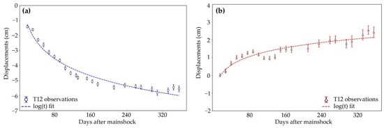 It is clear in Figure 5 that obvious postseismic deformation can be observed, even only 20 days after the earthquake. In 356 days, the minimum surface displacement of −6.5 cm can be observed in the LOS direction (moving away from the satellite), while the maximum surface displacement of 2.5 cm can be observed in the LOS direction (moving toward the satellite). The postseismic deformation is mainly located on the eastern side of the fault and is dominated by subsidence. The western side of the fault is uplifting, but the displacements were relatively small. The coseismic and postseismic deformation maps of the A-A’ profile perpendicular to the surface trace of the fault have similar shapes (Figure 3b,c). The postseismic deformation on the profile is nearly an order of magnitude smaller than the coseismic deformation. In order to analyze the trend of postseismic deformation with time, the deformation of the two square areas was extracted from the postseismic deformation time series (Figure 5). The deformation time series of the extracted areas was fitted using the following logarithmic function [].