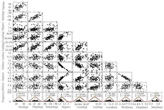 Model parameter trade-offs (scatter plots) and standard deviations (black histograms) for the uniform-slip model. Each of the 100 dots is the best-fit solution for one data set to which Monte Carlo, correlated noise has been added (see text). Note the red waved lines represent probability distribution curves and the green dotted lines represent optimal model parameters solutions.