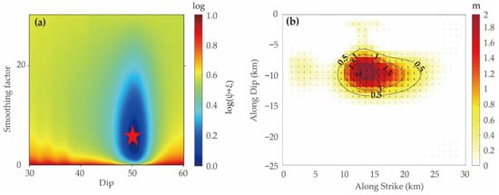 When the orientation of the fault plane was known, the slip distribution on the fault plane could be refined using a linear inversion. Based on the fault geometry from the uniform model, the fault length (along the strike) was extended to 30 km, the fault width (along the dip) was extended to 25 km, and the top depth was set to 0 km. The fault plane was divided into 750 small squared fault planes of 1 km × 1 km. The least square method was used to invert the slip of each small fault plane. Since the dip obtained by the previous inversion was not optimal for the inversion of fault-slip distribution, it was necessary to re-estimate the dip and determine the optimal dip []. In order to avoid the violent fluctuation of the slip on the fault plane, the optimal dip angle and smoothing factor of the fault were determined by comprehensively considering the model roughness and the model fitting residual []. The function was defined to estimate the optimal dip angle and smoothing factor []. Among them, is the dip angle, is the smoothing factor, is the fitting residual, and is the roughness of the slip distribution model. The optimal dip angle was determined as 50.2°, and the optimal smoothing factor was 6 (Figure 8a).