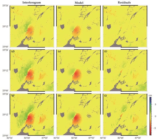 (a,d,g) are interferograms of 80, 176, and 308 days, respectively. (b,e,h) are the modeled interferograms based on the afterslip models (Figure 9), and (c,f,i) are their corresponding residuals.