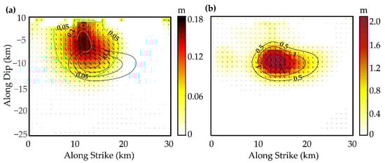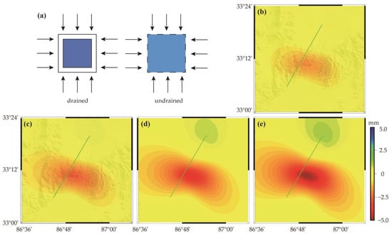 The deformation of poroelastic rebound is generally obtained by differencing the simulated coseismic displacements based on the Okada model in an elastic half-space with undrained and drained conditions (Figure 12a) [,]. The equation is shown below,