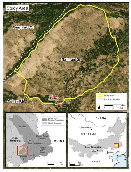 The study area is the central portion of Naiman Banner (2324 km2). Located at E120°19′40″–121°35′40″, N42°14′10″–43°32′20″, Naiman Banner is situated in the eastern portion of the Inner Mongolian Autonomous Region of China and on the southern edge of the Horqin Sandy Land District approximately 700 km northeast of Beijing (Figure 1). Naiman Banner is a semi-arid ecosystem characterized by its undulating sand dunes and meadows. Due to dune movement caused by wind, the topography is dynamic and varying []. Elevation ranges from 300 to 400 m, with the highest elevation along the western side of the banner where the landscape is much sandier with highly mobile dune fields []. Elevation slopes downward from west to east, transitioning from mobile dunes to semi-fixed and fixed dunes and then to flatter, gently sloping meadows. Vegetation cover exists in a gradient across the landscape from west to east, aligned with the gradient of dune stabilization from mobile to fixed [].