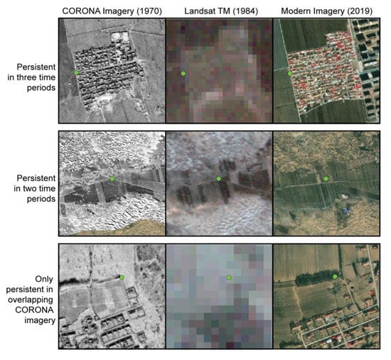 Based on reports from previous studies [,,], it was determined that at least 20 ground control points should be collected for each strip for a total of 80 ground control points across four strips. In landscapes with an abundance of potential ground control points, more may certainly be collected; however, many studies have achieved sufficient accuracy with between 20 and 30 ground control points per strip [,,]. A minimum of 10 ground control points is required to georeference with a third-order polynomial []. Distinct features such as built-up urban areas and road intersections are best for georeferencing because they are typically static through time. Corona imagery presents a unique challenge in that a majority of useful features for ground control points did not exist in this area in 1970. Additionally, utilizing Landsat TM imagery as a reference point is difficult because of its low spatial resolution. Many of the built-up areas and road crossings present in Naiman Banner in 1970 are not visible in the Landsat TM imagery and therefore cannot reliably be referenced in the Corona imagery. Modern, very high spatial resolution imagery is also difficult to utilize due to the dynamic and changing landscape in Naiman Banner, with shifting dunes and rapidly expanding urban areas. Locating reliable ground control points was time-consuming and required a combination of both reference imagery and making use of overlapping, previously georeferenced strips. Examples of ground control points using several imagery dates can be seen in Figure 4.