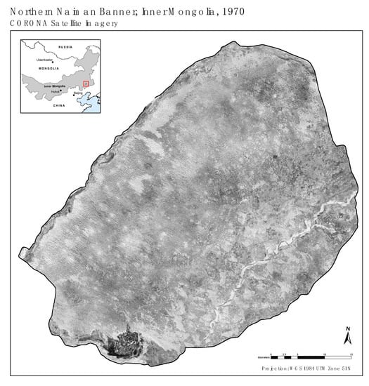 Final mosaic of central Naiman Banner, Inner Mongolia in 1970 derived from Corona imagery. Red box in inset map shows approximate location of the study area.