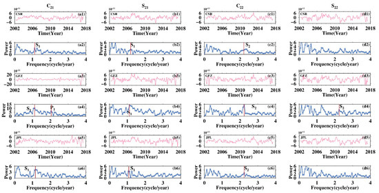 Time series of the non-secular, non-seasonal GRACE low Stokes coefficients and their conventional discrete Fourier spectrum. (a1,a3,a5) C21 time series from CSR, GFZ, and JPL, respectively, and (a2,a4,a6) are their corresponding Fourier spectra; (b1–b6) C21 time series from CSR, GFZ, and JPL, respectively, and (a1–a6) are their corresponding Fourier spectra for S21; (c1–c6) C21 time series from CSR, GFZ, and JPL, respectively, and (a1–a6) are their corresponding Fourier spectra for C22; (d1–d6) C21 time series from CSR, GFZ, and JPL, respectively, and (a1–a6) are their corresponding Fourier spectra for S22.