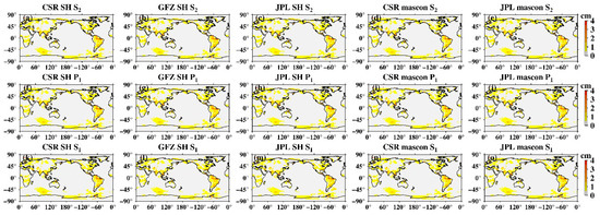 Least-square fit of the global amplitudes of S2, P1, and S1 tide aliasing. (a–e) Amplitude maps of the S2 aliasing in CSR SH data, GFZ SH data, JPL SH data, CSR mascon data, and JPL mascon data, respectively; (f,g) amplitude maps of the S2 aliasing in CSR SH data, GFZ SH data, JPL SH data, CSR mascon data, and JPL mascon data, respectively; (h–o) amplitude maps of the S1 aliasing in CSR SH data, GFZ SH data, JPL SH data, CSR mascon data, and JPL mascon data, respectively.