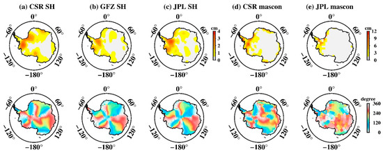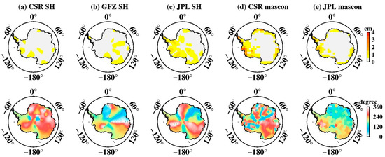 Spatial amplitude and the corresponding phase maps of S2 tide aliasing over Antarctica. (a–e) Estimated from CSR SH data, GFZ SH data, JPL SH data, CSR mascon data, and JPL mascon data, respectively. The upper row is the spatial amplitude and the bottom row is their corresponding phase.