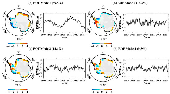 EOF-mode solutions (spatial patter and time series) of the (non-seasonal) mass variation over Antarctica from GRACE data. (a–d) Modes 1-4 (Mode 1 representing ACD). The spatial patterns are normalized with respect to standard deviation; the time series manifests equivalent water-thickness in cm.