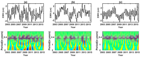Time-frequency wavelet spectra of EOF Modes 2–4 (from Figure 4). Prominent signals at the quasi-periodicity of ~0.4 year or ~161.0 days are evident. (a–c) time series of EOF Mode 2–4 (Upper panels) and corresponding wavelet spectra (lower panels).