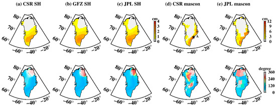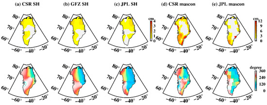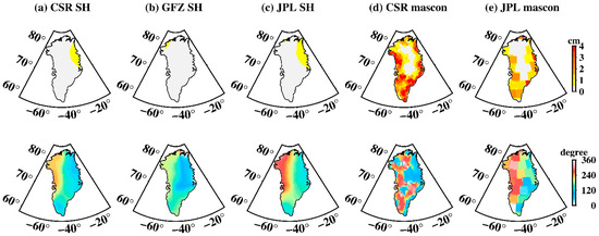 Spatial amplitude and the corresponding phase maps of S2 tide aliasing over Greenland. (a–e) Estimated from CSR SH data, GFZ SH data, JPL SH data, CSR mascon data, and JPL mascon data, respectively. The upper row is the spatial amplitude and the bottom row is their corresponding phase.