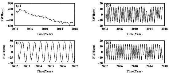 (a) Time series of point A at Figure 10 from CSR mascon data; (b) the fitted 171.2-day P1 sinusoid; (c) least-square fits of the simi-annual oscillation for the period 2002–2006; (d) least-square fits of the simi-annual oscillation for the period 2002–2017.