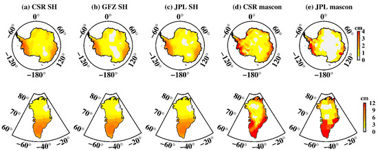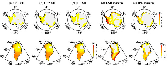 Unlike low-degree coefficients, high degree coefficients are also influenced by tide aliasing [16], we thus investigated the spatial distribution of tide aliasing using Stokes coefficients up to degree and order 60. Mascon solutions provided by CSR and JPL were also investigated. At each grid, we used the least-square-fit linear trends and amplitudes of annual, semi-annual, 161.0-day S2, 171.2-day P1, and 322.1-day S1 aliasing signals. Figure 2 presents the global amplitudes of S2, P1, and S1 aliasing. The S2 tide aliasing in SH solutions (Figure 2a–c) is most obviously at high latitudes, particularly regions over West Antarctica. A few tropical oceans show stripe-like S2 aliasing. In particular, oceans around North-West Australia, may reflect the deficiencies of the ocean tidal models [27]. Moreover, some land regions, e.g., the Amazon River basin also shows noticeable amplitudes, possibly due to errors in the S2 atmospheric tide [28], or nonseasonal hydrology variations [13]. Those results are consistent with what has reported based on previous GRACE RL01 and RL04 versions (e.g., [12,13,14]), delivering the gloomy fact that there is no essential improvement with the latest RL06 version in suppression of S2 tide aliasing. The S2 tide aliasing in mascon data (Figure 2d,e) has certain features that are clearly different from SH data. S2 aliasing over tropical oceans in mascon solutions has greatly reduced, however, its amplitudes over polar oceans are much greater, e.g., the Arctic Ocean and the Weddell Sea near West Antarctica. In addition, S2 aliasing over West Antarctica and peripheral Greenland is much larger than SH data (for detail see Section 3.3 and Section 3.4).