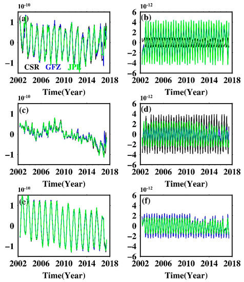 The S2 semi-diurnal tide will produce long-period variations in order 2 Stokes coefficients, Cn2/Sn2, while the P1 and S1 diurnal tide will alias in Cn1/Sn1 [25]. We mainly focused on C22/S22 and C21/S21, coefficients that are the most sensitive to tide perturbations. Higher-degree coefficients can be also affected by tide aliasing of course, but the magnitude of the perturbation will be greatly attenuated with increasing degree [26]. Figure 1 shows the non-secular, non-seasonal time series of Stokes coefficients C21/S21 and C22/S22, as well as their conventional discrete Fourier spectrum, derived from CSR, GFZ, and JPL SH solutions. S1 aliasing in C21/S21 is evident for all datasets, and coefficients from GFZ are more susceptible to its disturbance compared with that of CSR and JPL, as judged from their normalized power series. P1 aliasing is virtually unnoticeable in C21/S21 coefficients; only GFZ’s C21 coefficient shows weak P1 aliasing. S2 aliasing is widely presented in C22/S22 and is also much pronounced for GFZ data. Low-degree coefficients clearly show the impact of tide aliasing on GRACE data and reveal that the new tidal models adopted in the RL06 version do not perfectly simulate the actual tides.