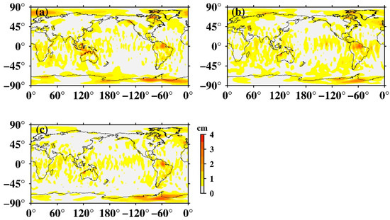 Global amplitude maps of S2 tide aliasing after removal of the 161.0-day oscillation in low zonal coefficients. (a) Fitted from CSR SH data; (b) fitted from GFZ SH data; (c) fitted from JPL SH data.