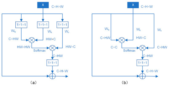 With the nonlocal neural networks proposed in [30], attention is introduced to computer vision. Good results are achieved in image classification, video tracking, and semantic segmentation. Figure 2a shows how the nonlocal module characterizes the inter-pixel relationship by computing the similarity between any two pixels on the feature map and using the Softmax function. Following the attention mechanism, the inter-pixel relationships are global. In one way, this nonlocal operation is equivalent to noise reduction, which removes noise in the feature map. In another way, it can acquire long-distance dependencies and global semantic information, compared to classical convolution, which aggregates local information continuously. The authors of [31] describe the nonlocal module as a location-based attention mechanism model that deals with the correlation between each location and all other locations. Softmax creates a feature map of HW × HW and then acts on this feature map to generate the correlation between pixels at each location and pixels at any other location, thus constructing the global semantic information based upon the location. This idea led to constructing a channel-based model, as shown in Figure 2b. This function considers the correlation between each channel and every other channel, and by computing a C × C feature map, it computes the correlation between channels and thus generates the global semantic information based on channels.