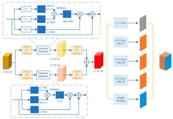 An important issue in the change detection process is accurately classifying each pixel that constitutes an object at different scales in an image. This study uses the atrous spatial pyramid pooling (ASPP) module for multi-scale information extraction. By downsampling the ASPP module by a factor of 8, it includes a 1 × 1 convolution and three 3 × 3 dilated convolutions with expansions from [12,24], as well as a global averaging pooling to obtain image-level features as a way to capture multi-scale features. Dilated convolutions tend to degenerate to simple 1 × 1 convolutions with only the center of the convolution kernel being valid. Therefore, image-level features are added, and a pooling operation is performed on the entire global image. The result is passed through a 1 × 1 convolution using bilinear upsampling, and the module can capture multi-scale features efficiently.