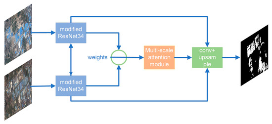 The dual neural network is a class of neural networks with the same structure and shared parameters [32]. It has the characteristics of using dual-temporal remote sensing image input data in the building change detection task. Therefore, this study combines dual neural networks to construct a building change detection model structure with dual-stream input. The structure is based on the modified ResNet34 mentioned above. The two branch networks have the same structure and shared parameters. The dual-temporal images enter the two branch networks separately to extract features and then perform a subtraction operation to highlight the differences in features. This is beneficial for subsequent building change detection.
