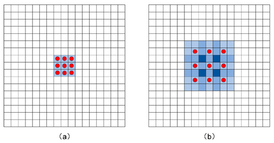 The contrast between dilated convolution and traditional convolution. (a) normal convolution, (b) 3 × 3 null convolution with an expansion rate of 2.