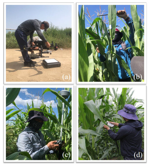 SPAD measurement is non-destructive to crops. The SPAD-502 Plus Portable Chlorophyll was used to determine the current relative amount of chlorophyll in the leaves by measuring the absorption rate of leaves in the red region and the near-infrared region. The result was a unit-free but highly repeatable measurement. Previous studies have used portable instruments (e.g., SPAD-502 Plus) to characterize SPAD with a satisfactory accuracy. The process of measuring the SPAD data using SPAD-502 Plus is shown in Figure 2d.