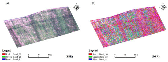 Images of six spectral transformations of the original hyperspectral image of the UAV on 30 July: (a) SSR, (b) DSR, (c) RSR, (d) RDSR, (e) LSR, (f) LDSR.