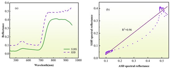 Verification of the reliability of the Cubert S185 hyperspectral image data. (a) Comparison of spectral curves between ASD and Cubert S185. (b) Correlation analysis of spectral data between ASD and Cubert S185.