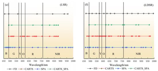 The number of characteristic bands selected by the initial CARS and SPA was large, which led to problems such as having a complex model, large calculation amount, and poor robustness. Then, the characteristic bands used for modeling were extracted using the CARS_SPA combined algorithm. The distribution of the characteristic bands corresponding to the CARS_SPA algorithm was as follows: (1) SSR: 574, 590, 686, 694, 710, 798, 814, 866, 890, and 906 nm. (2) DSR: 466, 470, 490, 538, 614, 626, 642, 666, 786, and 834. (3) RSR: 526, 538, 614, 650, 682, 830, 866, 882, and 894 nm. (4) RDSR: 558, 622, 642, 666, 678, 710, 790, 842, 858, and 918 nm. (5) LSR: 490, 514, 682, 754, 814, 850, 866, and 882 nm. (6) LDSR: 490, 538, 622, 642, 666, 754, 766, 858, 878, and 962 nm.