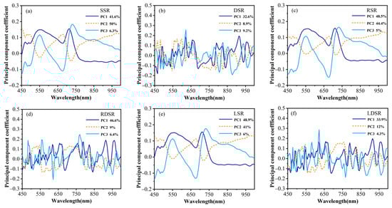 The first three principal components (PCS) of PLSR explained the highest variance ratio of the different spectral regions obtained from the different data sets: (a) SSR, (b) DSR, (c) RSR, (d) RDSR, (e) LSR, (f) LDSR.