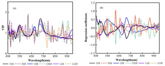 The PCA algorithm of the PLSR model analyzed the spectral data, and the spectral diversity of the hyperspectral images of the summer maize canopy showed a varying reflectance under the different spectral transformations. As shown in Figure 7, the PC1~PC3 of SSR, RSR, and LSR were relatively consistent. Similarly, the PC1~PC3 under the differential transformation of DSR, RDSR, and LDSR were also consistent. When the PLSR model was established with a summer maize canopy reflectance of 450–998 nm, the canopy reflectance in the VIP area was found to be important for the estimation of the SPAD values, especially in relation to the data sets for SSR, RSR, and LSR for the wavelengths centered at 550 nm and 720 nm (Figure 8a). Relatively low VIP scores were observed in the near-infrared and SWIR spectral regions. The regression coefficient of the PLSR model further illustrated the relative importance of canopy reflectance in the different regions (Figure 8b). The leaf reflectance in the DSR and LDSR data sets showed large regression coefficients at 550–998 nm, while the regression coefficients in the SSR, LSR, and RSR data sets were relatively small. The results showed that the regression coefficient of leaf reflectance of DSR was the largest, with peaks at 610 nm, 780 nm, and 920 nm. There were also regression coefficients for leaf reflectance of SSR, LSR, and RSR. These results showed that the contribution of spectral regions to the evaluation of the SPAD values by the PLSR model was not consistent across the different data sets.