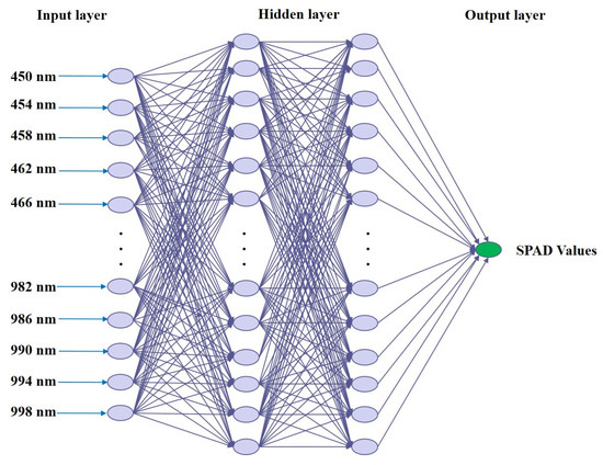 Similar to the RF model, XGBoost could directly gauge the importance of each variable. “Importance” measured the value of the variables in the construction of the tree. In the summer maize SPAD values hyperspectral estimation model, the more times a band was used to build a decision tree, the more important it was. The band importance obtained by the XGBoost algorithm is shown in Figure 11. From this, it can be seen that the bands with higher importance were concentrated between 550 and 566 nm, which overlapped with the bands with a higher correlation. The importance was reduced at around 714 nm in the spectral red-light range but increased at 706 nm. The first 20 bands of the 138 bands accounted for over 67% of the contribution value. The DNN model added the full band spectral data of the training samples to the model through the input layer (Figure 12) and finally obtained the inversion model of the summer maize SPAD values.