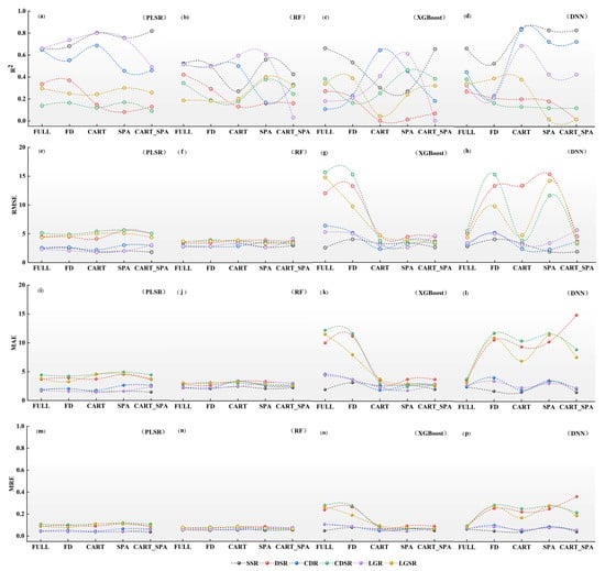 Using SSR, DSR, RSR, RDSR, LSR, and LDSR, among other spectral transformation data, the characteristic bands were assigned to the parameters of the regression model. The regression algorithms, namely PLSR, RF, XGBoost, and DNN, were used to construct the maize SPAD values inversion model, the inversion accuracy of which was then verified. As shown in Figure 13, marked differences were observed in the accuracy of the inversion model based on the characteristic bands.