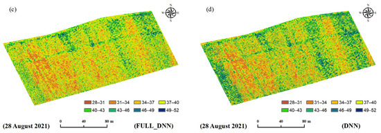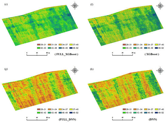 According to the accuracy evaluation results (Figure 13), the accuracy of the SPAD values inversion model built based on the CART_SPA algorithm was the best among the four ML regression models. Therefore, after selecting this model, each pixel point of the 10 characteristic band images selected by the hyperspectral CARS_SPA algorithm collected on July 30 was substituted as the model input parameter into the PLSR, RF, XGBOOST, and DNN prediction models to obtain the SPAD values of each pixel point in the experimental area. From this, the grid was reclassified for display, and a visualization map of the summer maize SPAD values was obtained. To highlight the effects of the model, the full band image was also input into the four ML models as model parameters. The visualization map of the summer maize SPAD values of the full band image under SSR spectral data is shown in Figure 14. From the visualizations of the four models, it can be seen that the visualizations of the PLSR and DNN estimates with higher verification accuracies were closer to reality.