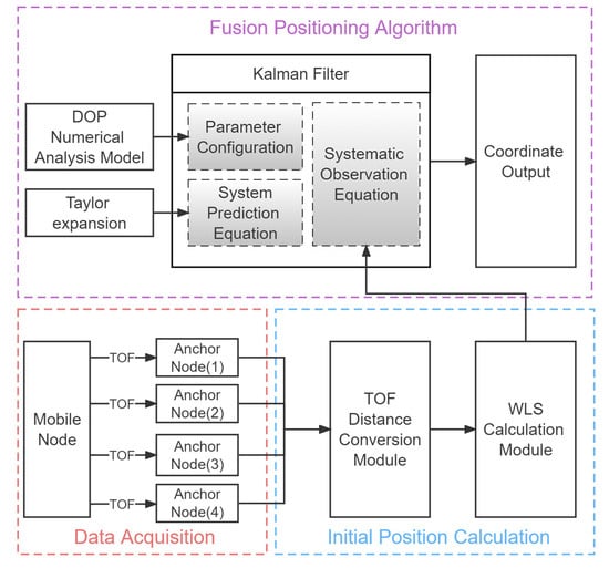 The positioning framework is shown in Figure 1. Firstly, the distance between the UWB base stations and the tag was measured by double-sided two-way ranging to complete the initial data acquisition. Based on the ranging data, the WLS method was used to calculate the initial coordinate of the tag, which was considered as the observation values of KF. Secondly, the position dilution of precision (PDOP) value of the positioning scene was acquired by the DOP numerical analysis model, and it was used as the reference value of the observation noise covariance of KF. Finally, the state equation of the system was constructed by Taylor expansion to complete the positioning algorithm.