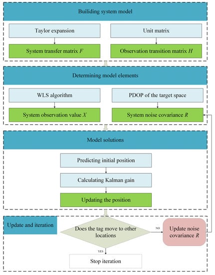 The accuracy of the estimated parameters of the KF technique depends, to a large extent, on the correct knowledge of the covariance matrix Q of its model noise and the covariance matrix R of the measurement noise [,]. The statistics of Q and R highly influence the Kalman gain K and, consequently, the error of the measurements, where the covariance matrix R of the measurement noise represents the confidence in the filtering system on the observed values []. Meanwhile, the DOP values reflect the sensitivity of the positioning system to the ranging error: the larger the DOP value, the lower the positioning accuracy of the UWB system, and the less credible the positioning output []. Therefore, the adaptive combination of the DOP numerical analysis model with the covariance matrix R of the measurement noise of KF can be considered to improve the positioning accuracy of the existing algorithms in the narrow space.