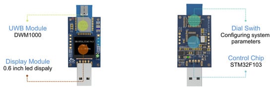 The hardware used in this experiment is shown in Figure 4. The bottom plate adopts an STM32F103 series single-chip microcomputer as the main control chip. Peripheral circuits include an LED display, charging interface, etc. The module is configured with DecaWave ‘s DWM1000. The hardware can be configured as a base station or a tag via USB instructions.