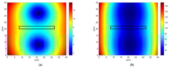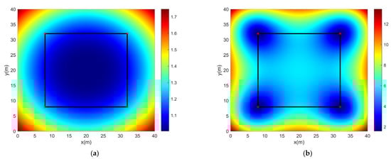 From the above equations, it is not difficult to find that the HDOP and PDOP values are obtained by the LS estimation, and their values reflect the possible accuracy of UWB measurement positioning. The size of the PDOP values is positively correlated with the error of the base station positioning. The larger the PDOP values, the greater the amplification of the ranging error by the positioning algorithm, and the lower the positioning accuracy of the system []. In order to improve the positioning accuracy when the PDOP values are far greater than the normal value, the positioning error can be reduced by combining the PDOP numerical analysis model with KF. In this study, we calculated the PDOP values by changing the location of the test node throughout the space.