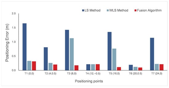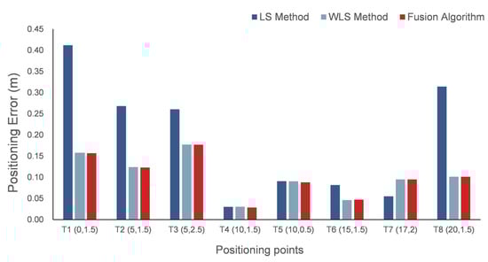 It can be seen from Figure 9 and Figure 10 that the positioning accuracy of the fusion positioning algorithm proposed in this paper was higher than that of the WLS positioning algorithm, and it was much higher than that of the LS positioning algorithm. According to the detailed error values in Table 4, for most points, the proposed fusion algorithm reported the lowest error in both scenes. For Scene A, the mean square error of the LS positioning algorithm was 93.77 cm; the mean square error of the WLS positioning algorithm was 42.94 cm; and the mean square error of the fusion positioning algorithm was 18.67 cm. Compared with the LS positioning algorithm and the WLS positioning algorithm, the fusion positioning algorithm improved the accuracy by 80.1% and 56.5%, respectively. For Scene B, the average positioning error of the LS positioning algorithm was 19.6 cm, and the average positioning error of the WLS positioning algorithm and the fusion positioning algorithm was 10.59 cm, which meets the requirements of high-precision positioning. Compared with the LS positioning algorithm, the fusion positioning algorithm improved the accuracy by 45.9%.